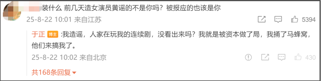 对于女方的持续爆料,于正的回应也显得慌乱,话术从否认恋情、许凯单身、聊天记录伪造、报警等手段,变成满满恶意的诅咒,指责女演员蹭热度,质疑其动机不纯,还“善恶到头终有报,相信天道轮回”。