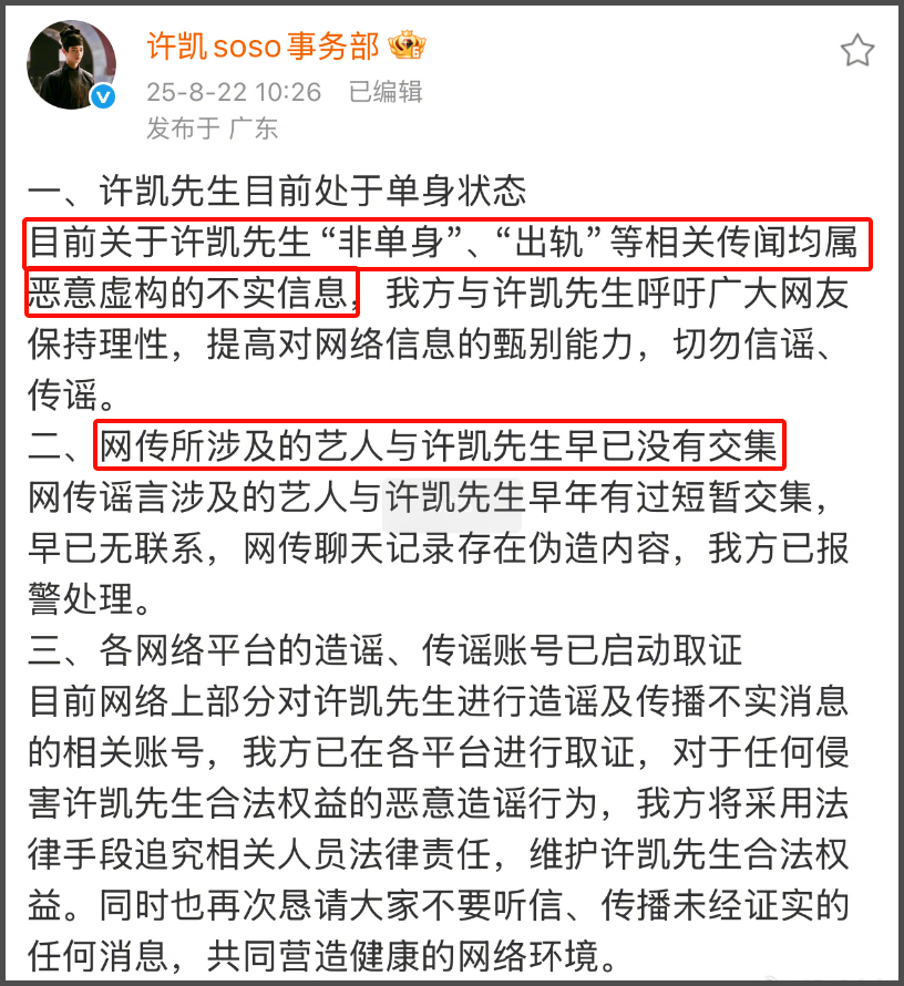 随着事态扩大,许凯工作室再次回应争议,否认出轨、非单身等传闻,但也没承认与许荔莎恋情,只表示两人多年没交集,还控诉对方部分聊天截图造假。