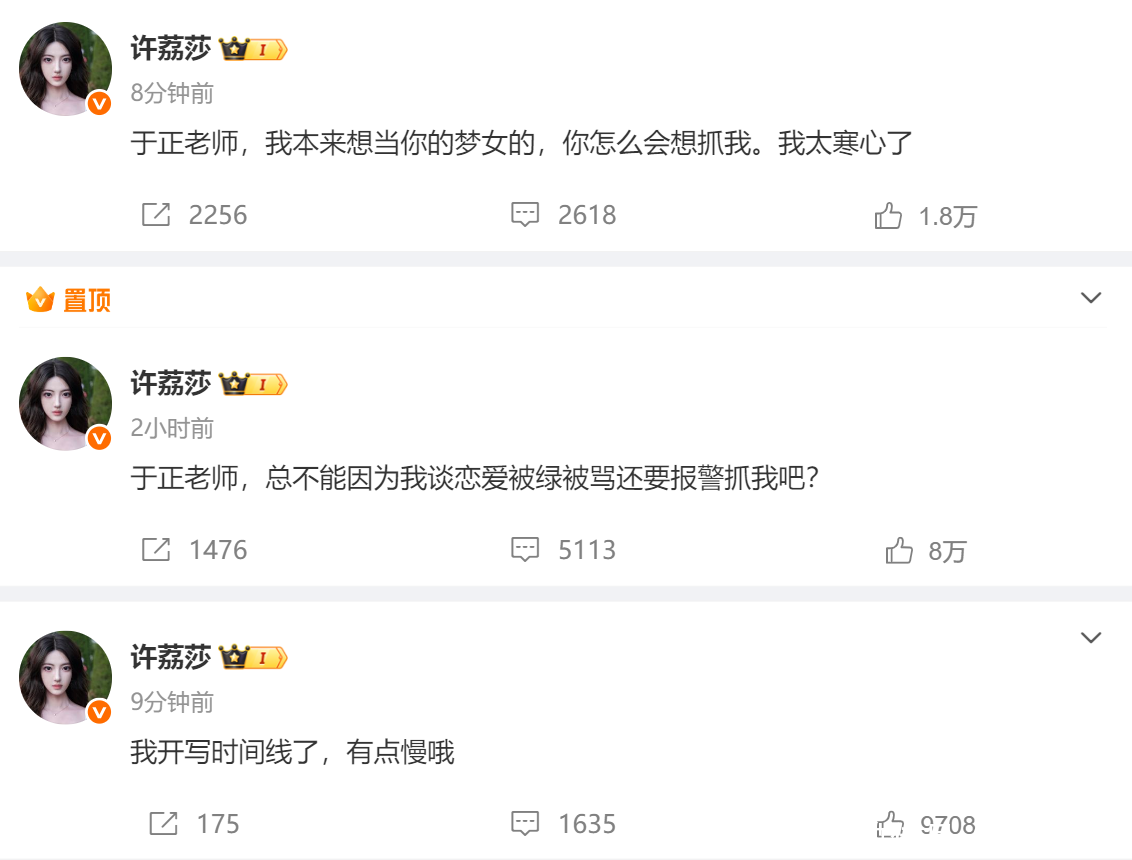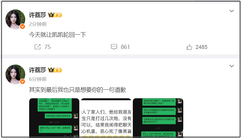 许荔莎称自己与许凯在2022年分手,原因是许凯与赵晴开房被拍。于正得知后指责她造谣,表示报警处理。随后,许荔莎晒出与许凯牵手图及许凯室内各种私下照片,嘲讽于正因为谈恋爱报警抓人行为,还让许凯等着收律师函。