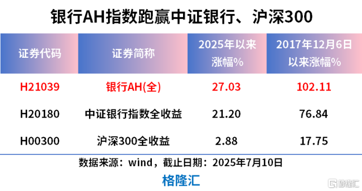 截至7月10日,银行AH全收益指数年内累涨超27%,相比中证银行全收益指数超额涨幅近6%。自2017年12月6日指数发布以来至2025年7月10日,银行AH全收益指数累计涨102.11%,同期中证银行全收益、沪深300全收益涨幅分别为76.84%、17.75%。