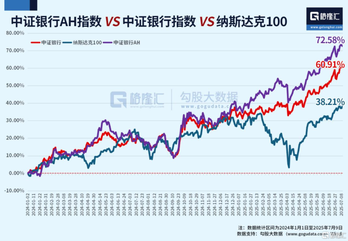 近一年以来,中证银行AH指数、中证银行指数大幅跑赢纳斯达克100指数。