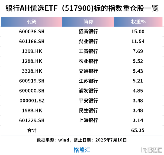 银行AH优选ETF(517900)是市场唯一跨AH两市的银行类ETF,也是唯一可投港股的银行类ETF,它跟踪银行AH指数,目前有42只成份股,其中,港股银行股14只,权重约40%,A股银行股28只,权重约60%,前十大成份股中包括在A股上市的招商银行、兴业银行、江苏银行、浦发银行、平安银行、上海银行;在港股上市的工商银行、农业银行、交通银行、民生银行。